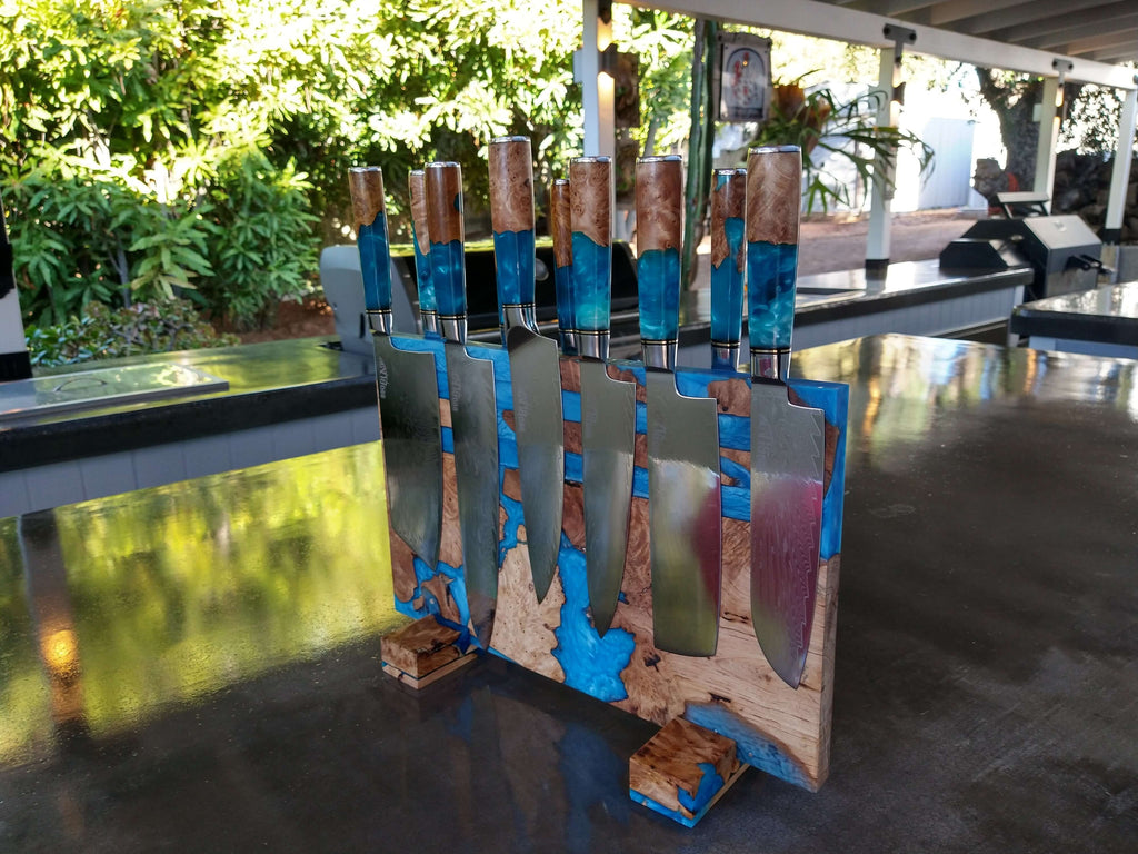 - Magnetic blade block holds knives securely on both sides