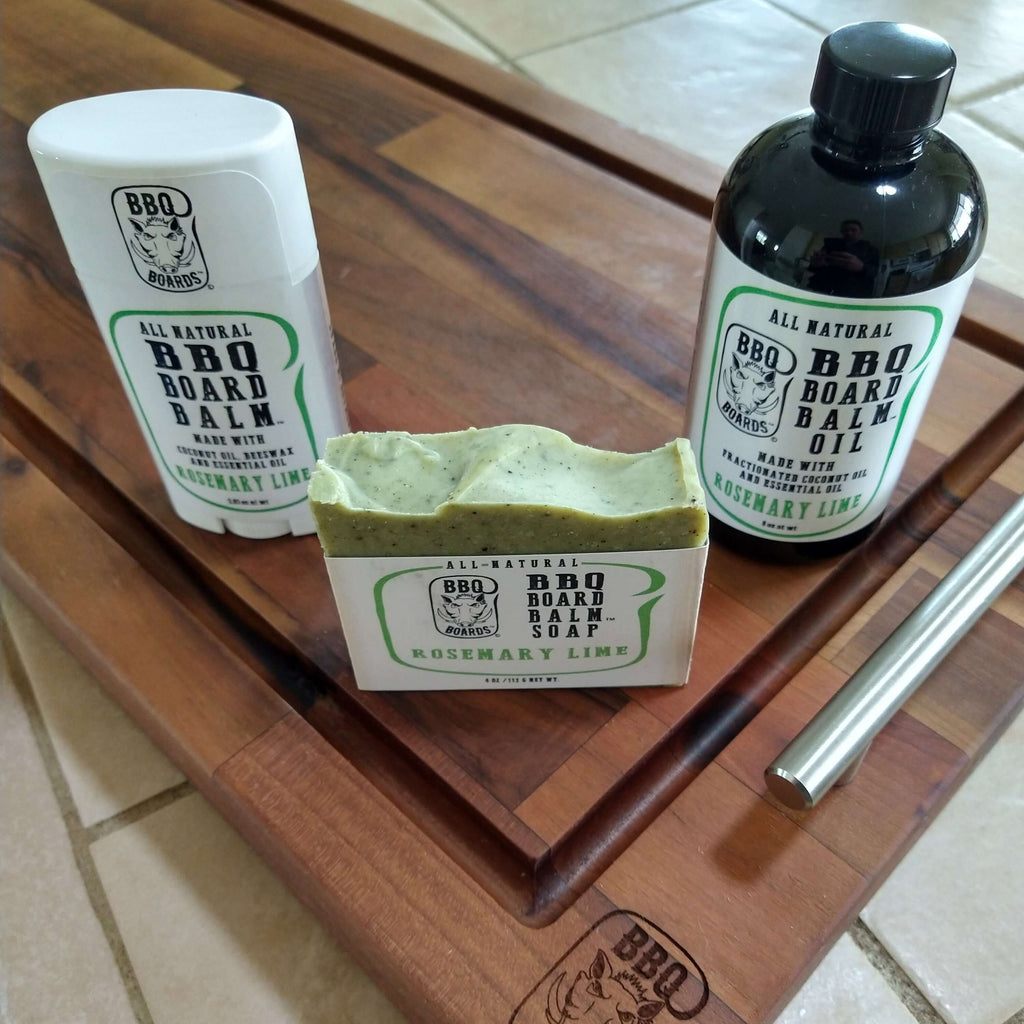 - BBQ Board Balm® Soap: Artisan live-edge bar designed for gentle cleaning; easily stored in a plastic bag between uses.