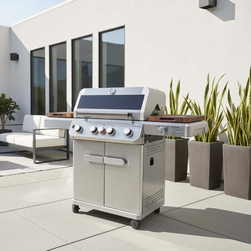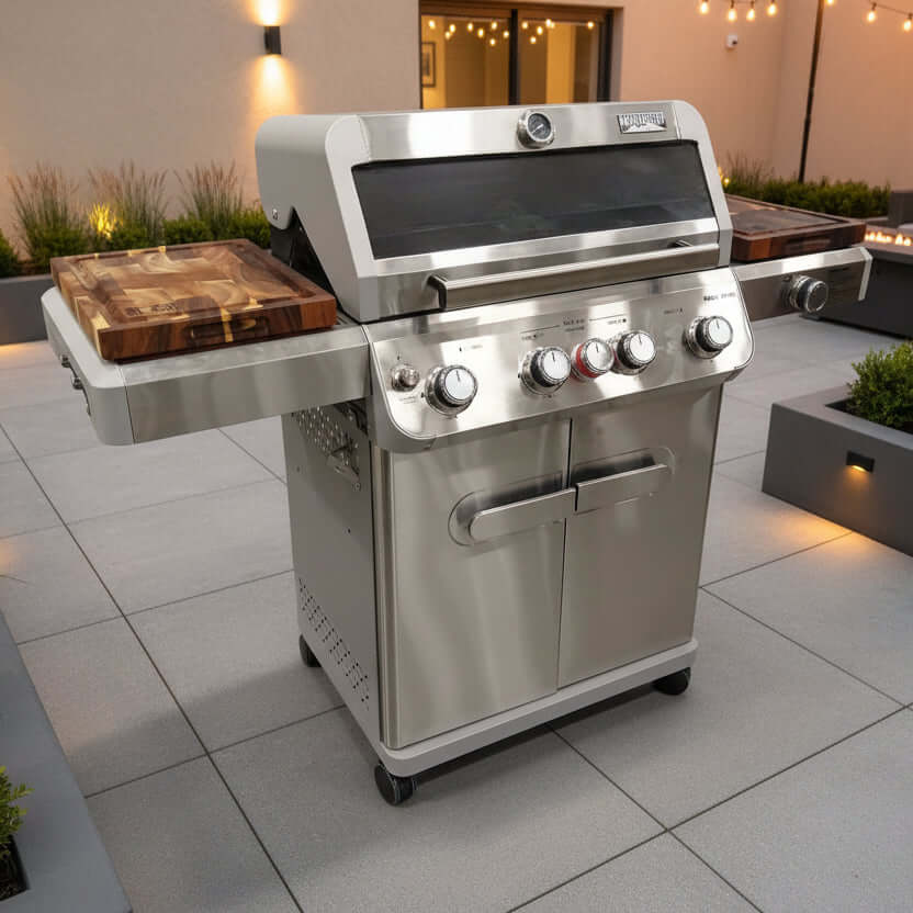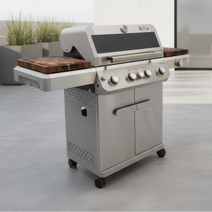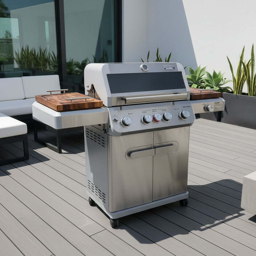 Instead of relying on standard metal side shelves, you gain two dedicated barbecue board workstations for slicing, assembling, staging, and serving directly at the grill.