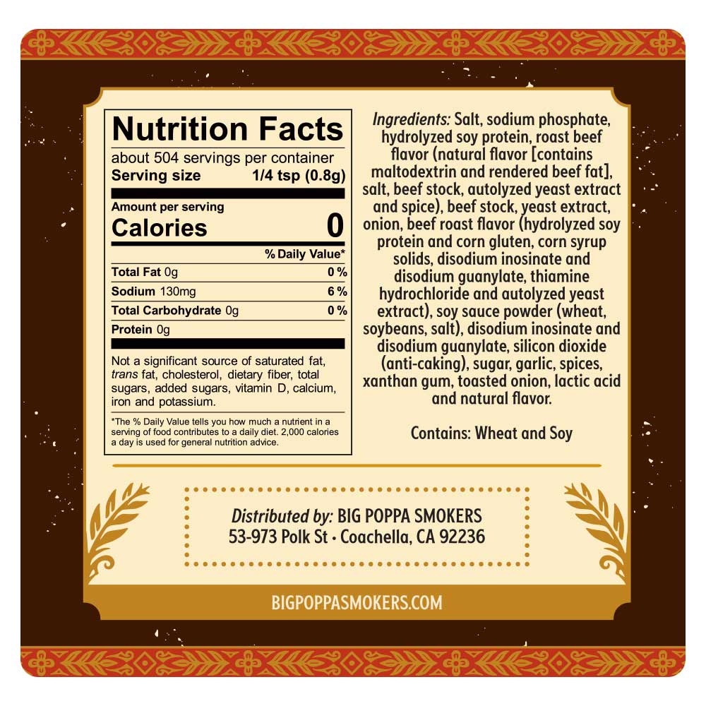 Ingredients: Salt, sodium phosphate, hydrolyzed soy protein, roast beef flavor (natural flavor [contains maltodextrin and rendered beef fat], salt, beef stock, autolyzed yeast extract, onion powder, garlic powder, beef roast flavor [hydrolyzed soy protein and corn gluten, corn syrup solids, disodium inosinate, disodium guanylate, thiamine hydrochloride, autolyzed yeast extract]), soy sauce powder (wheat, soybeans, salt), disodium inosinate, disodium guanylate, silicon dioxide (anti caking), sugar, spices, xanthan gum, lactic acid, natural flavor.
