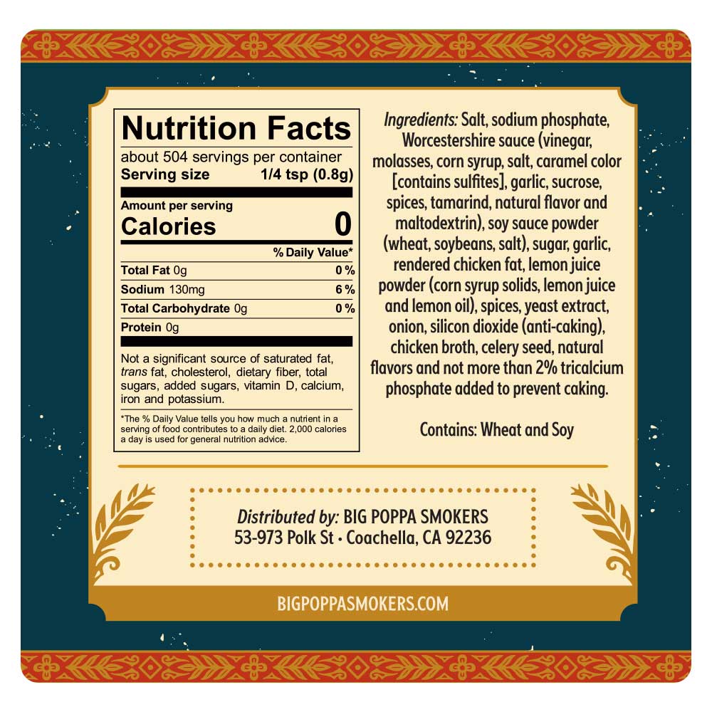 Ingredients: Salt, sodium phosphate, Worcestershire sauce (molasses, vinegar, corn syrup, caramel color [contains sulfites], garlic, sucrose, spices, tamarind, natural flavor, maltodextrin), soy sauce powder (wheat, soybeans, salt), sugar, garlic powder, onion powder, rendered chicken fat, lemon juice powder (corn syrup solids, lemon juice, lemon oil), spices, yeast extract, silicon dioxide (anti caking), chicken broth, celery seed, natural flavor, and not more than 2 percent tricalcium phosphate added to prevent caking.