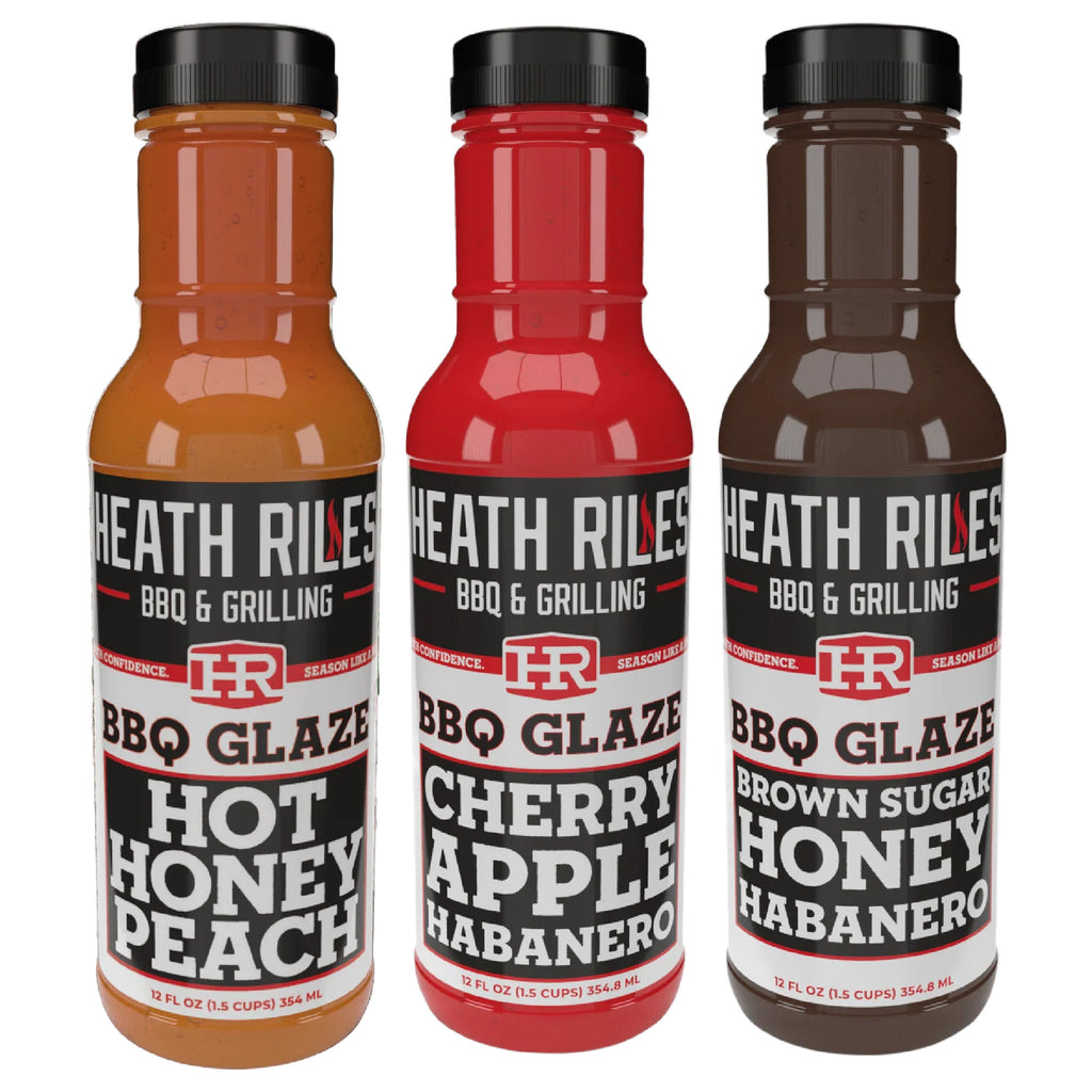 Heath Riles Competition Glaze 3-Pack combines three of Heath’s top-performing sweet-heat glazes—Cherry Apple Habanero, Brown Sugar Honey Habanero, and Hot Honey Peach—handpicked for building glossy, tacky, high-impact flavor on ribs, pork, chicken, and wings. Whether you're competing or cooking for a crowd, this trio gives you the exact finishing flavors used by top pitmasters.