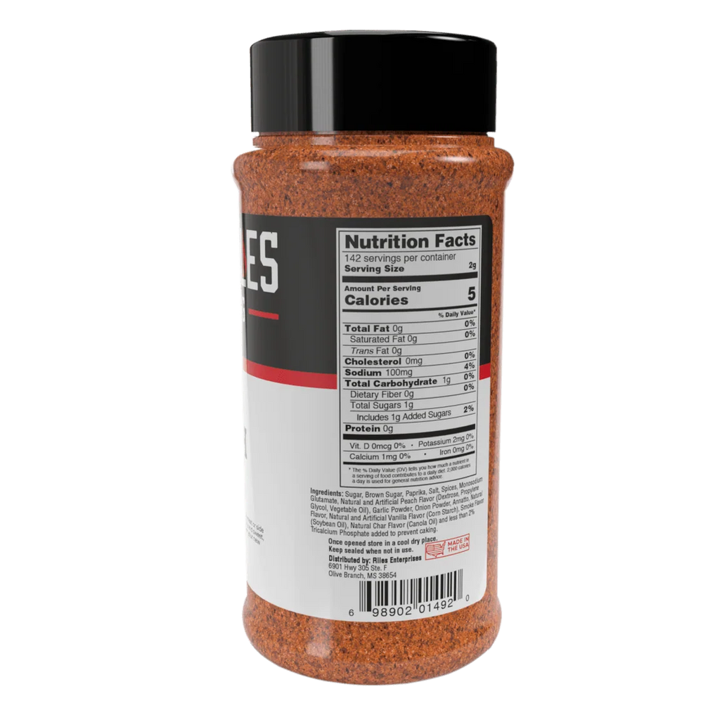 Sugar, brown sugar, paprika, salt, spices, monosodium glutamate, natural and artificial peach flavor (dextrose, propylene glycol, vegetable oil), garlic powder, onion powder, annatto, natural flavor, natural and artificial vanilla flavor (cornstarch), natural smoke flavor, natural char flavor (canola oil), and less than 2% tricalcium phosphate added to prevent caking.