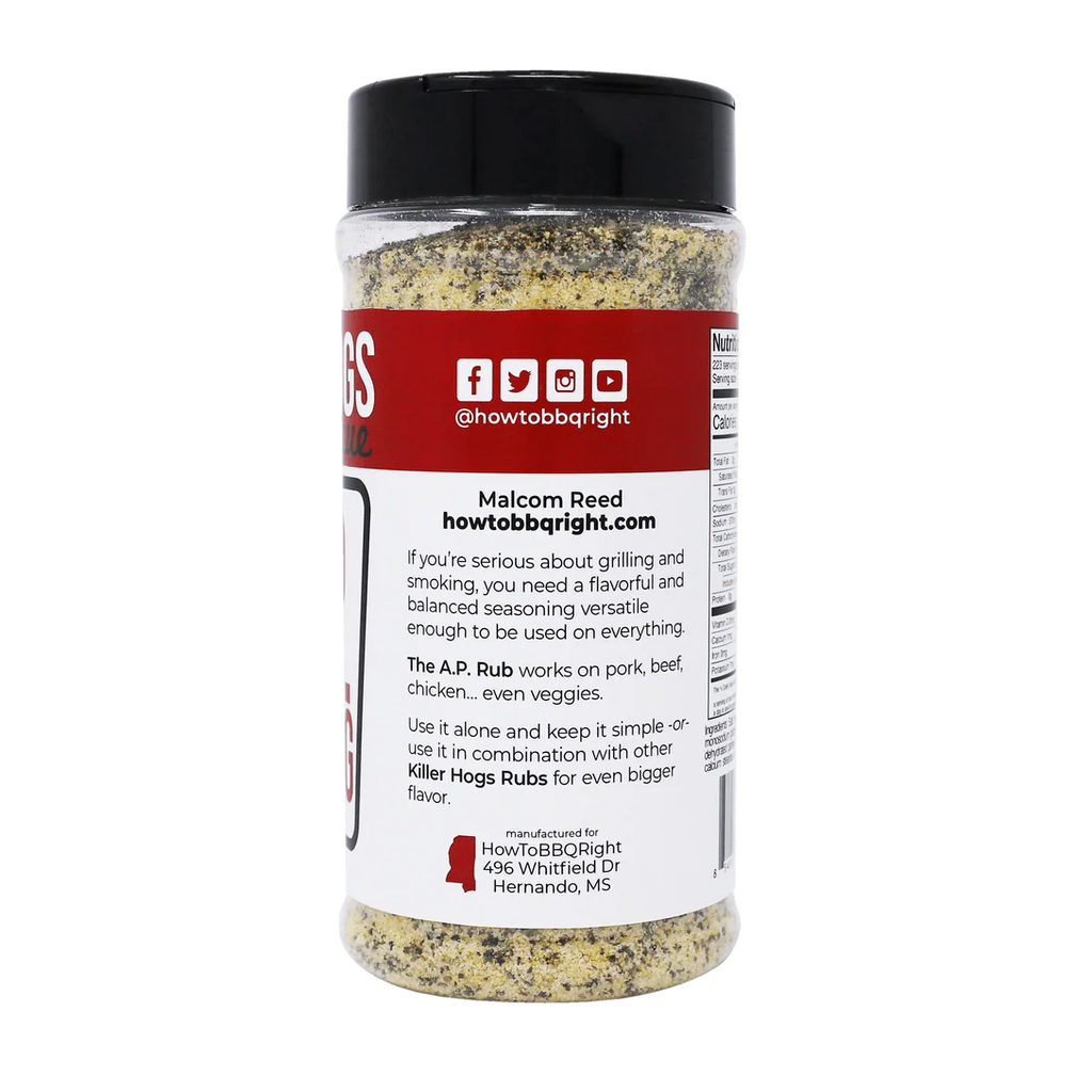 Killer Hogs A.P. Seasoning is the versatile all purpose BBQ rub pitmasters reach for when they want balanced flavor that works on almost anything. Built with a savory blend of salt, garlic, and spices, this seasoning enhances the natural flavor of meats and vegetables without overpowering them.