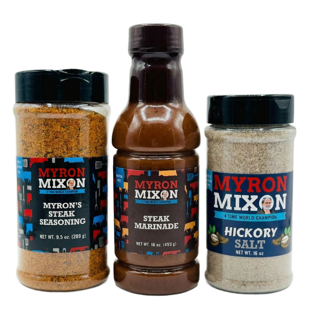 Start with Myron Mixon Steak Marinade to deepen flavor throughout the meat. Follow with Myron Mixon Steak Seasoning to build savory structure and balance. Finish with Myron Mixon Hickory Salt to lock in a rich crust and a light smoke-kissed bite that works on gas grills, charcoal, or cast iron. It is straightforward, reliable, and designed for the steaks you want to serve with confidence.