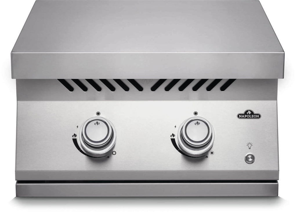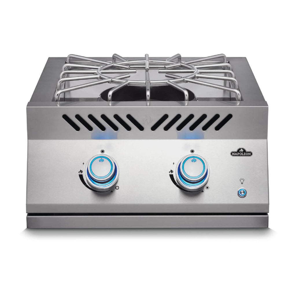 This unit integrates seamlessly with Napoleon Built-In 700 Series grills—including the 32", 38", and 44" models—or can be installed independently with the required power supply kit. Dual-level burner control gives you both ultra-high heat for boiling and gentle low heat for simmering, while the removable center ring is perfect for wok cooking. NIGHT LIGHT™ control knobs with SafetyGlow add visibility and safety: the soft blue illumination turns red when the burner is active, ensuring you always know when heat is on.