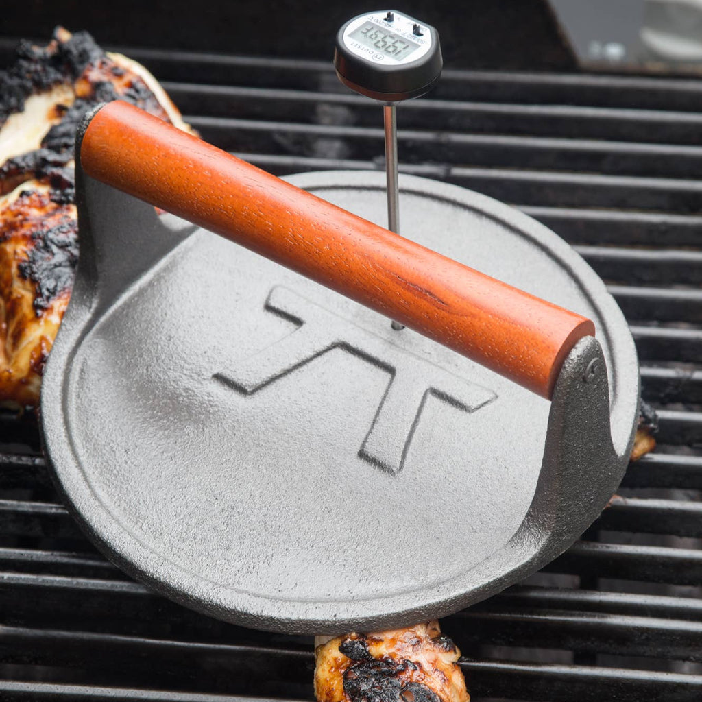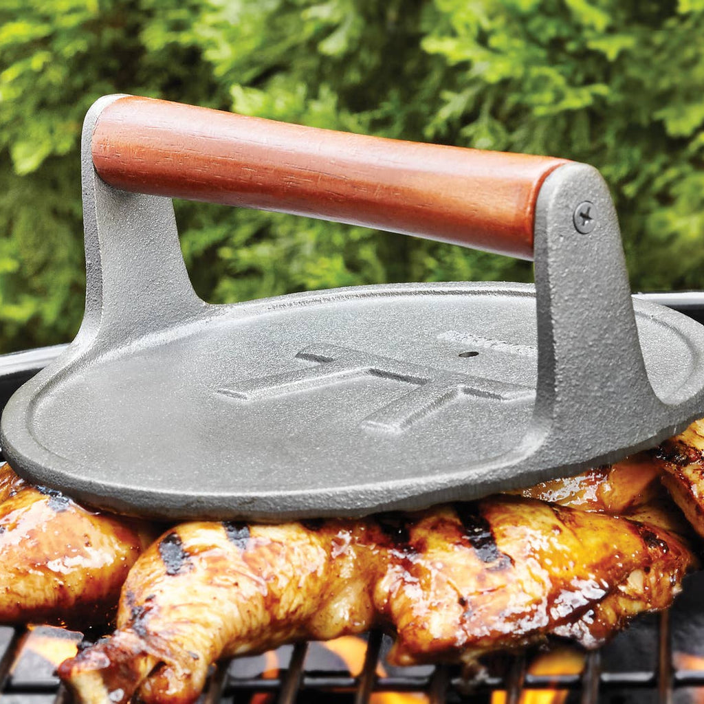 Outset Cast Iron Round Grill Press is built for grillers who want better contact, even cooking, and professional-looking results every time they fire up the grill or griddle. Whether you’re pressing steaks, burgers, bacon, or vegetables, this heavy-duty cast iron press delivers consistent heat distribution and reliable performance cook after cook.