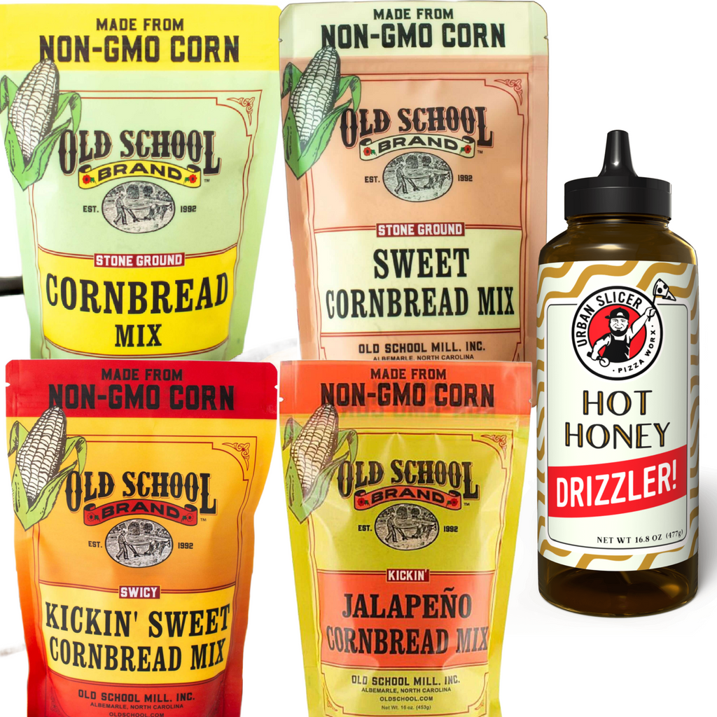 Southern Cornbread Sampler with Hot Honey Drizzler is the ultimate sweet-heat comfort food bundle for anyone who loves classic Southern baking, cornbread variety, and a drizzle of hot honey on top. This curated 5-pack brings together four Old School Brand cornbread mixes plus Urban Slicer Hot Honey Drizzler, so you can serve everything from traditional cast-iron cornbread to jalapeño-spiked “swicy” slices—all finished with smooth, pour-ready sweet heat.