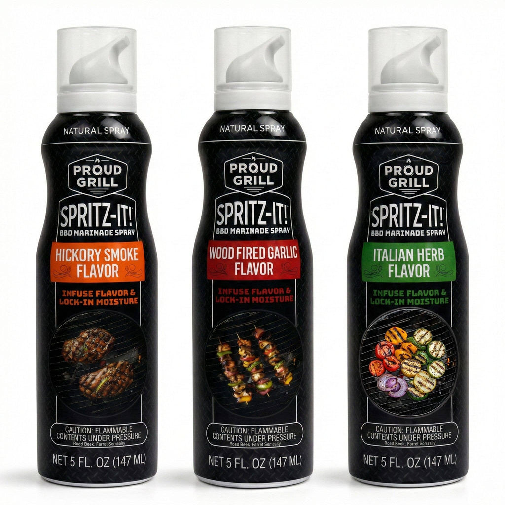 Proud Grill Spritz It BBQ Marinade Spray Variety Pack brings together all three oil-based flavors so you can infuse moisture, bind seasonings, and layer flavor with total control. If you want juicier protein and more consistent results, this trio gives you the flexibility to match flavor to the cook.