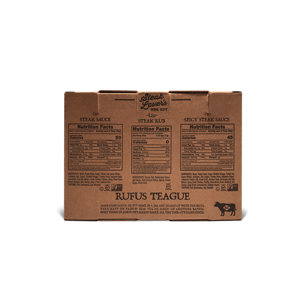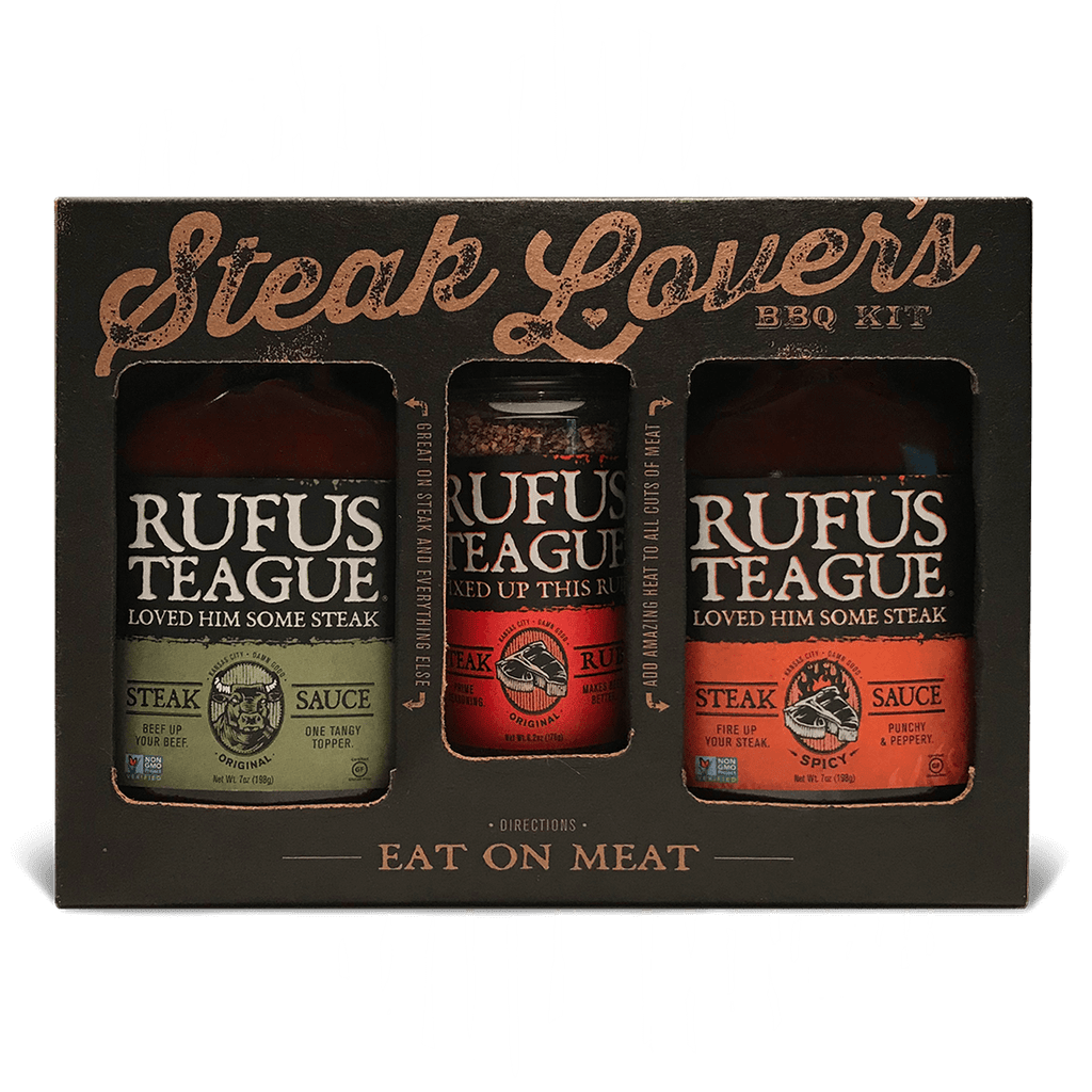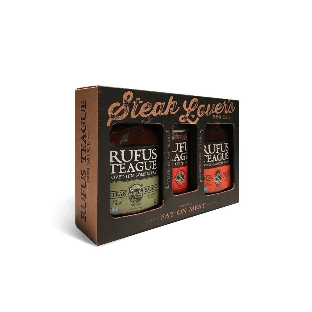 Rufus Teague Steak Lover’s Kit is built for people who know steak is special and refuse to settle for bland, watery steakhouse condiments. This complete flavor kit delivers thick, zesty steak sauces and a coffee-kissed steak rub that takes ribeyes, strips, filets, and sirloins to a whole new level.