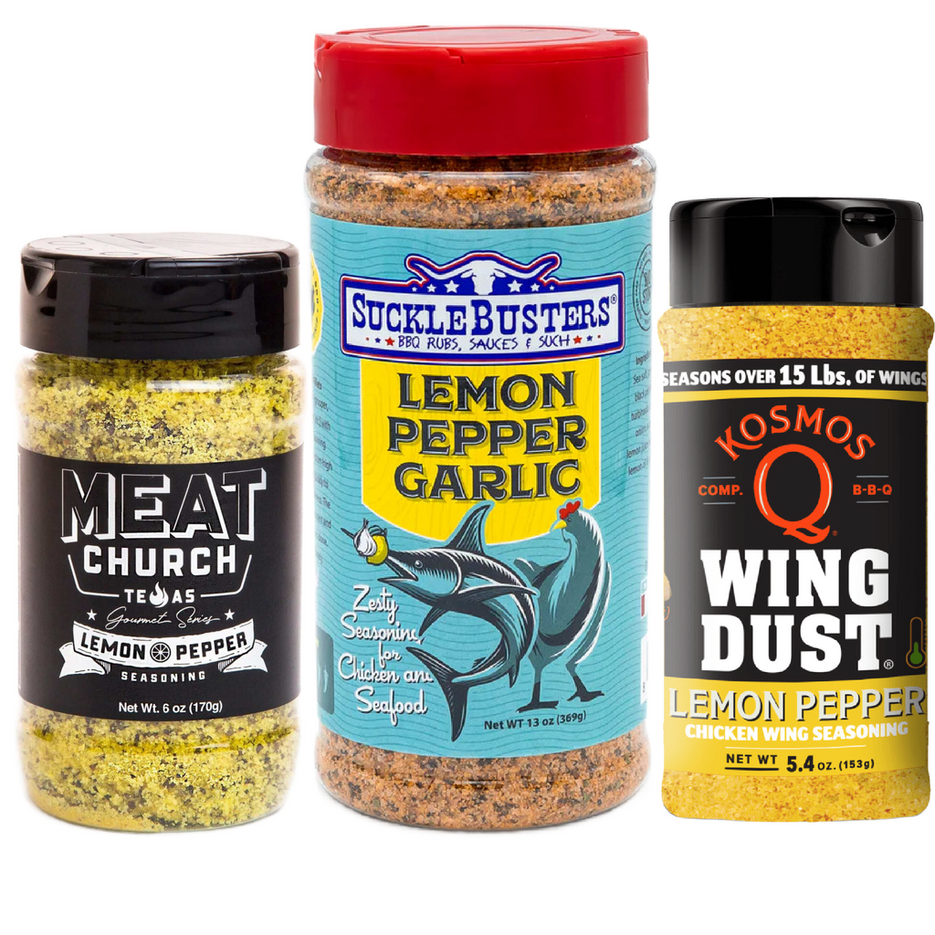 The Ultimate Lemon Pepper Seasoning Trio brings together three powerhouse blends from Kosmos Q, SuckleBusters, and Meat Church—each one crafted to deliver its own zesty, pepper-forward twist. From tangy chicken wings to perfectly grilled seafood, this curated set covers every flavor angle of lemon pepper perfection.