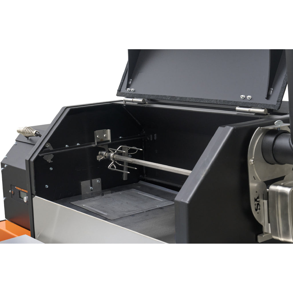 This rotisserie kit is designed for Yoder Smokers S-Series pellet grills equipped with a round stack collar and second shelf.